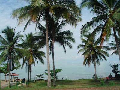 马来姑娘是附近村庄的居民,她给了几个地名,这天小伍就看路牌随机应变了:P。她听说小伍孤身上路,很夸张的大呼小叫,告诉他的马来朋友们,害得小伍担心隔天去马六甲会有不良份子打小伍孤身上路的主意,唉...... ~九点,小伍在村庄中停下休息,再吃煎饼补充能量。过了Kuala Sg.Bharu,在单调的大路右首,小伍望见远方的海,便毫不犹疑让爱马骑进村庄小路。